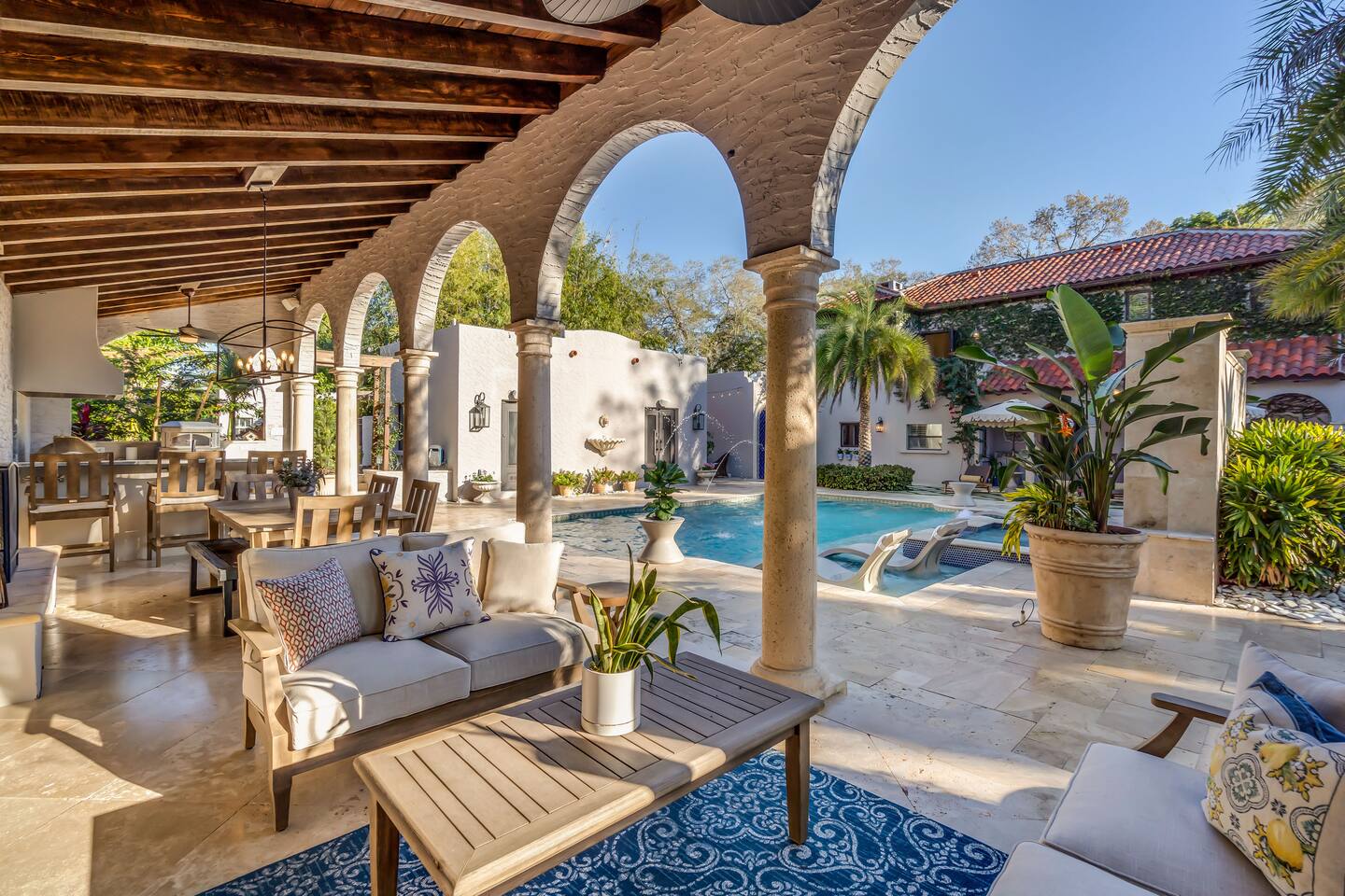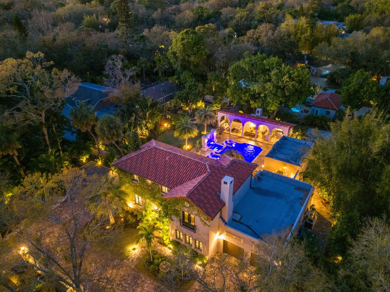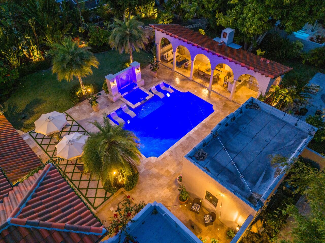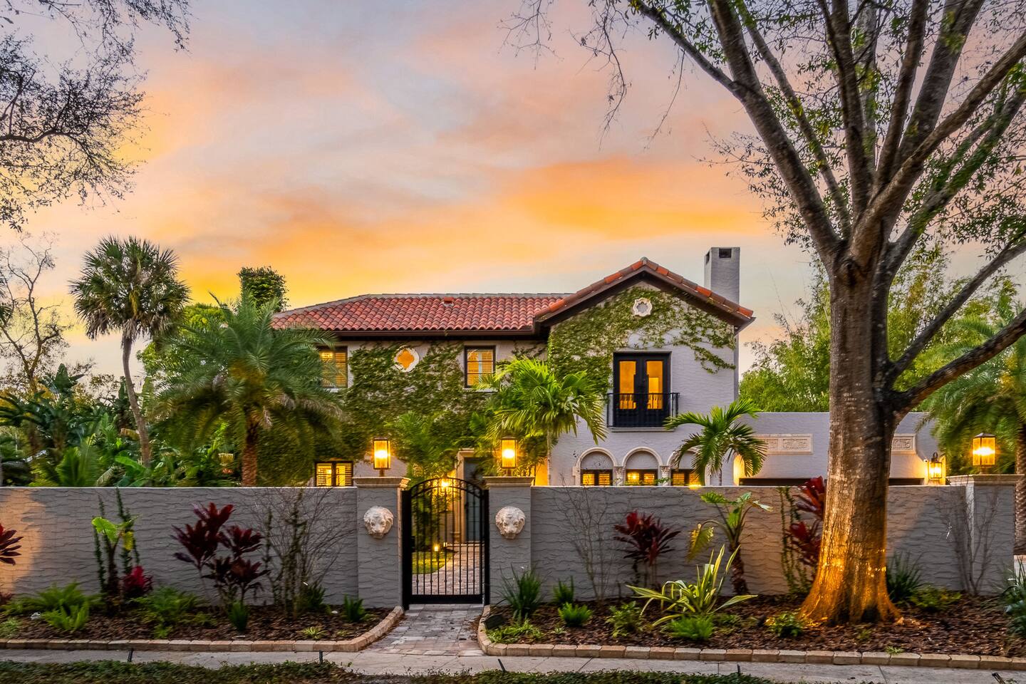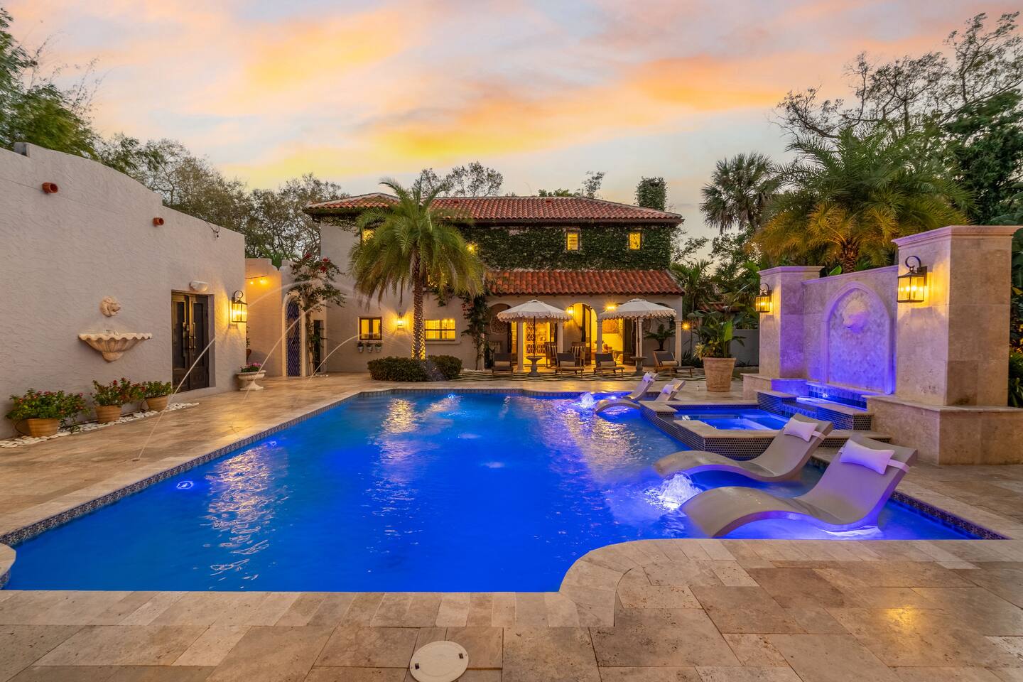 Indulge at this Mediterranean estate, boasting lush botanical gardens and rare tropical fruit trees for your picking pleasure. Enjoy the custom pool, hot tub, sauna, cold plunge and the home gym. The expansive outdoor haven features a fully-equipped kitchen, fireplace, TV, and dining space. Enjoy leisurely games of pool, ping pong & shuffleboard, then retreat to the luxurious indoors with comfortable beds and a massive TV, all within the privacy of a walled-in estate. Your lavish escape awaits.