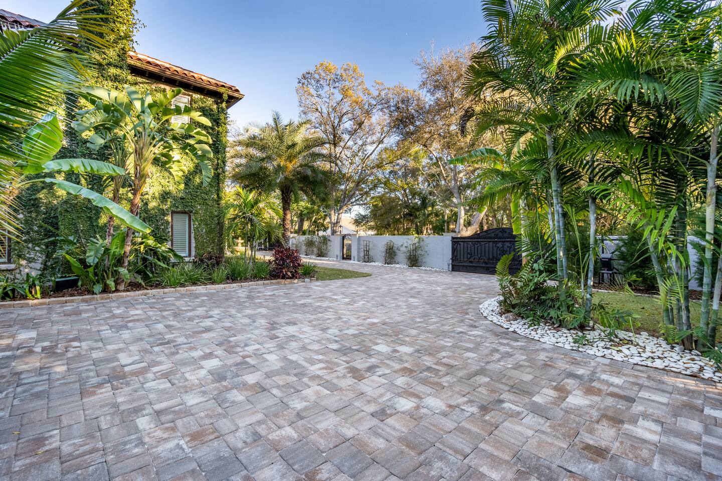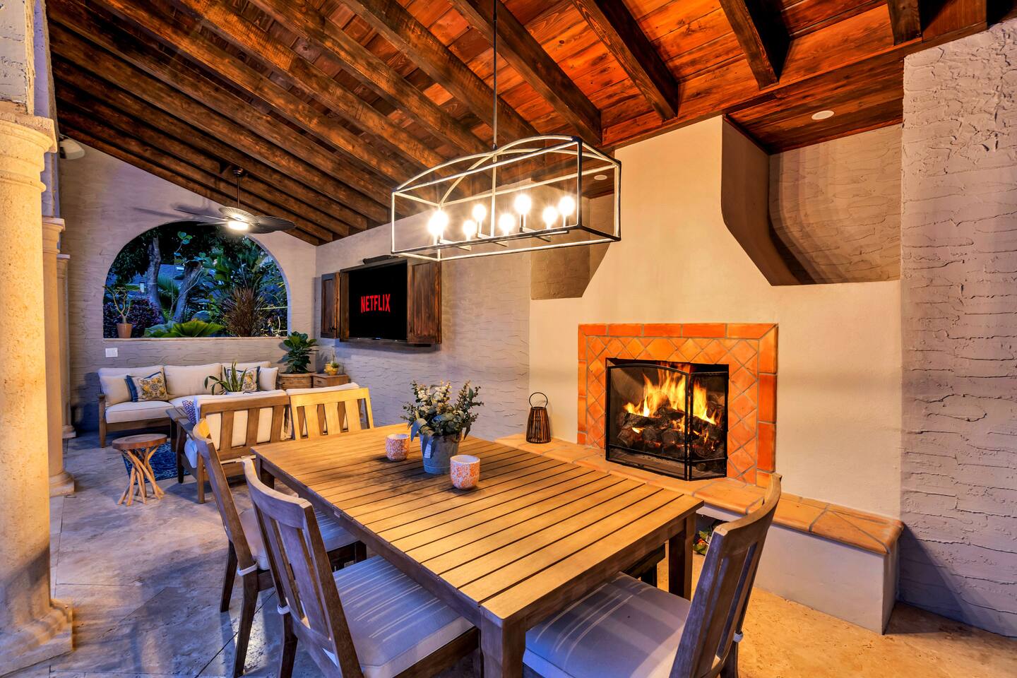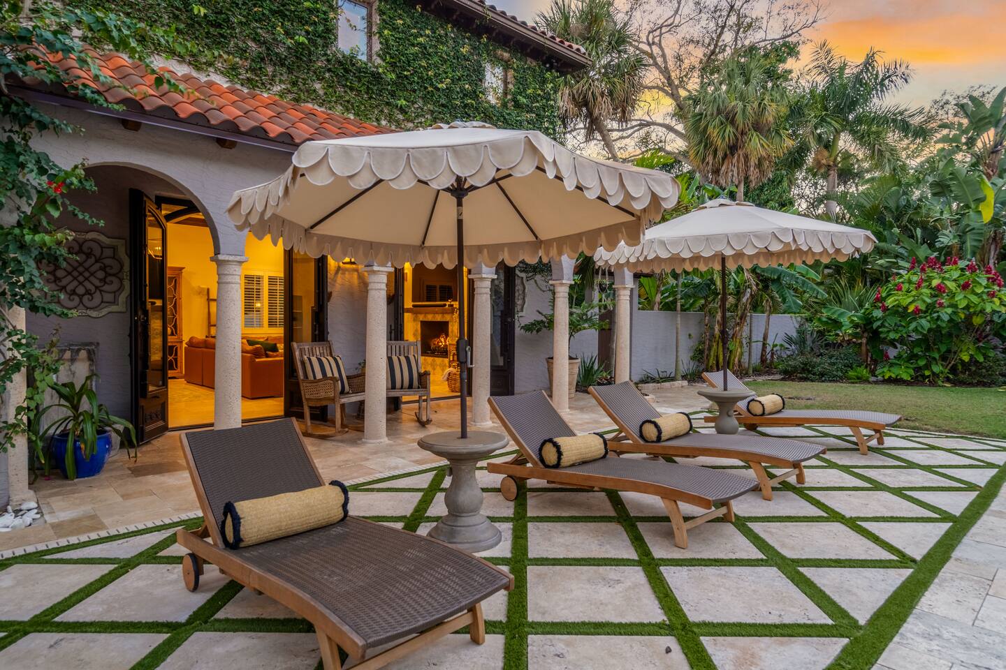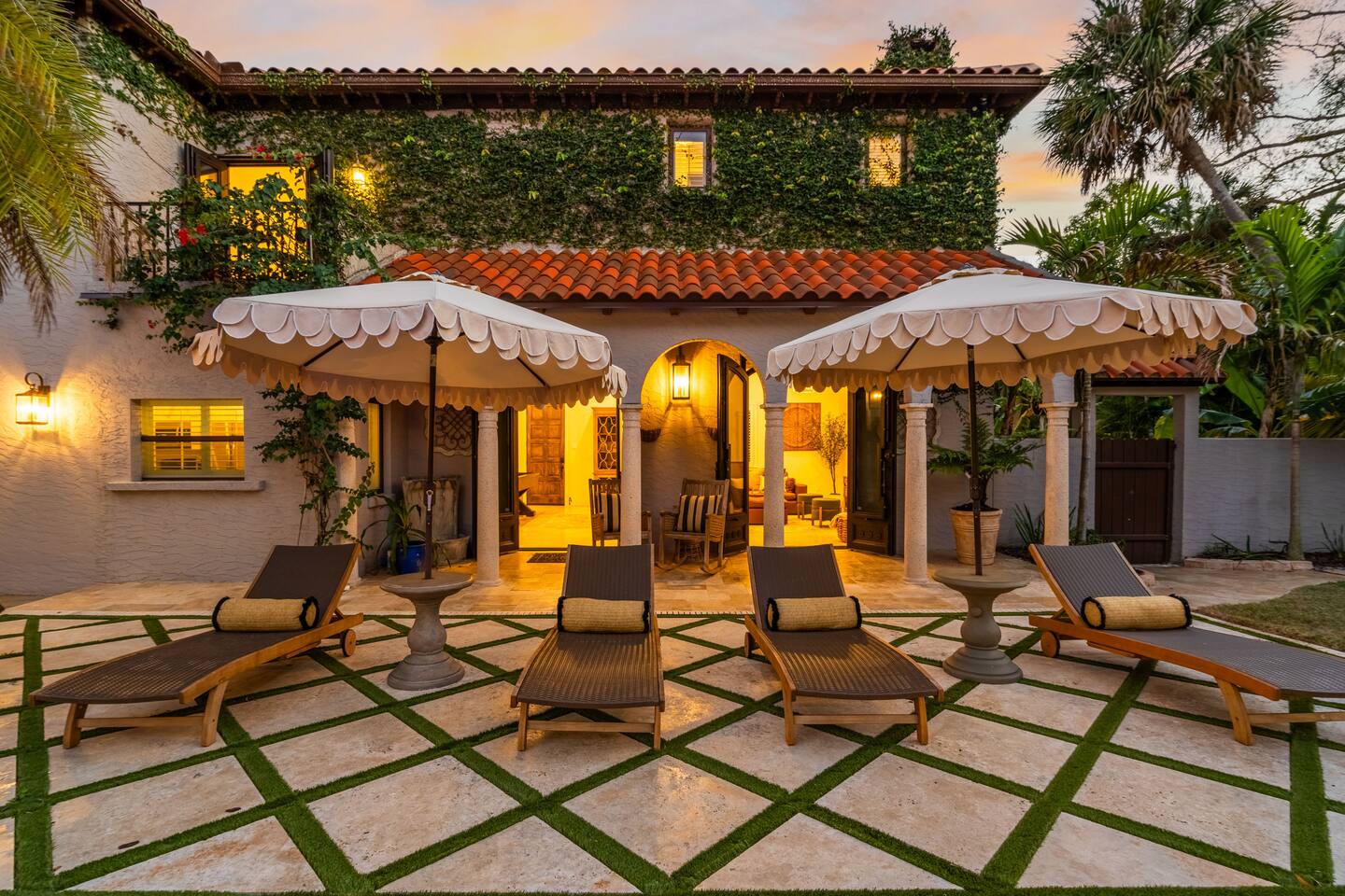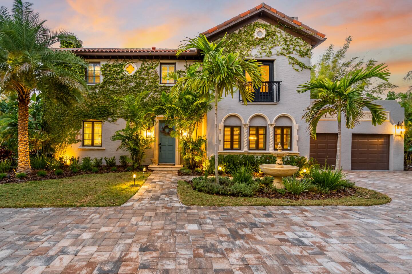 Indulge at this Mediterranean estate, boasting lush botanical gardens and rare tropical fruit trees for your picking pleasure. Enjoy the custom pool, hot tub, sauna, cold plunge and the home gym. The expansive outdoor haven features a fully-equipped kitchen, fireplace, TV, and dining space. Enjoy leisurely games of pool, ping pong & shuffleboard, then retreat to the luxurious indoors with comfortable beds and a massive TV, all within the privacy of a walled-in estate. Your lavish escape awaits.