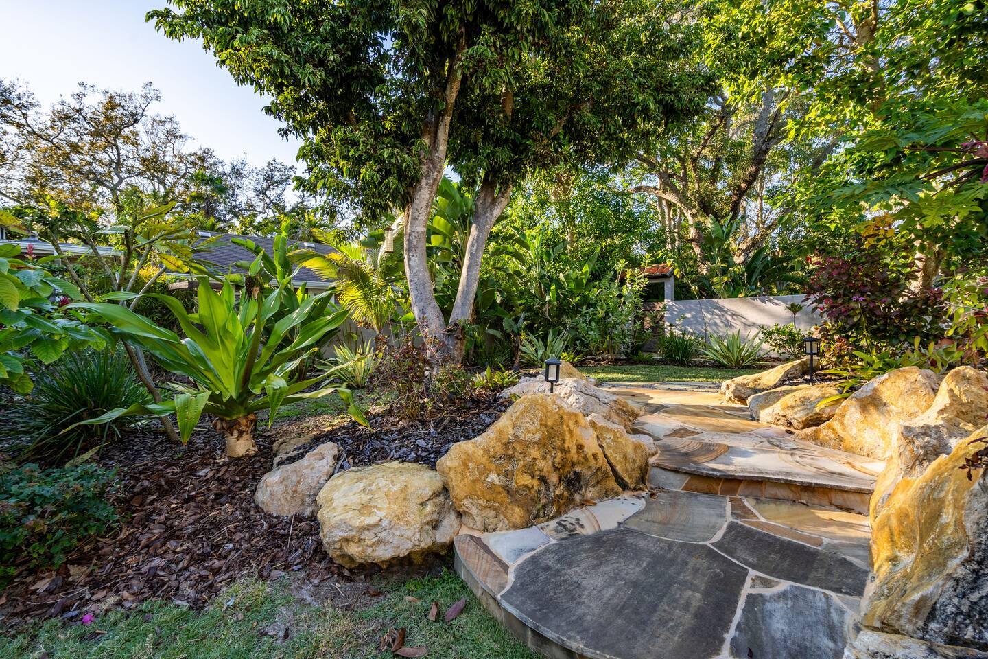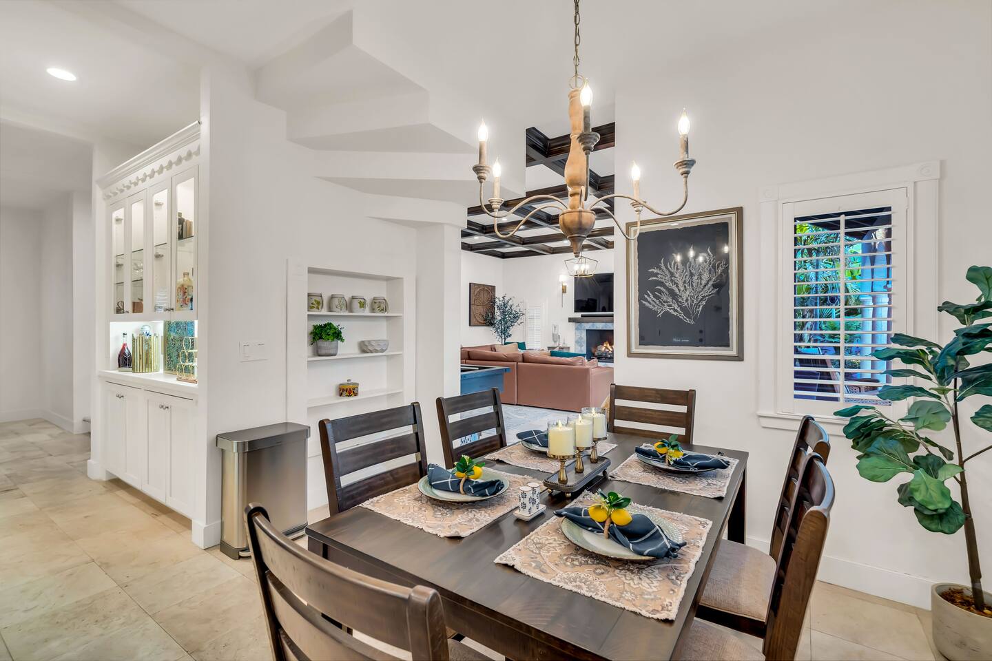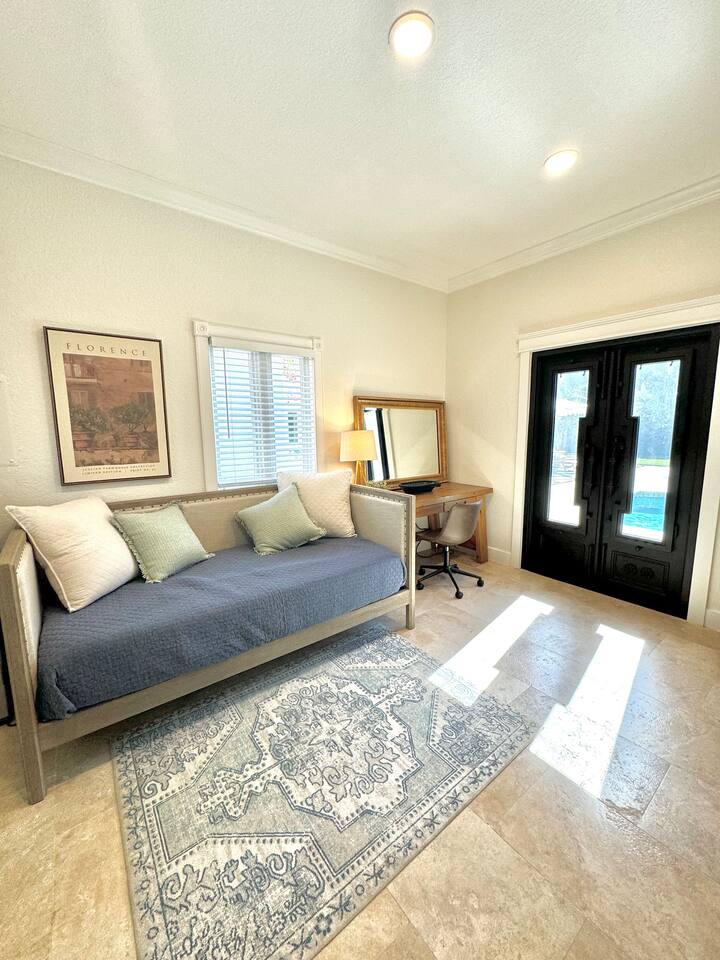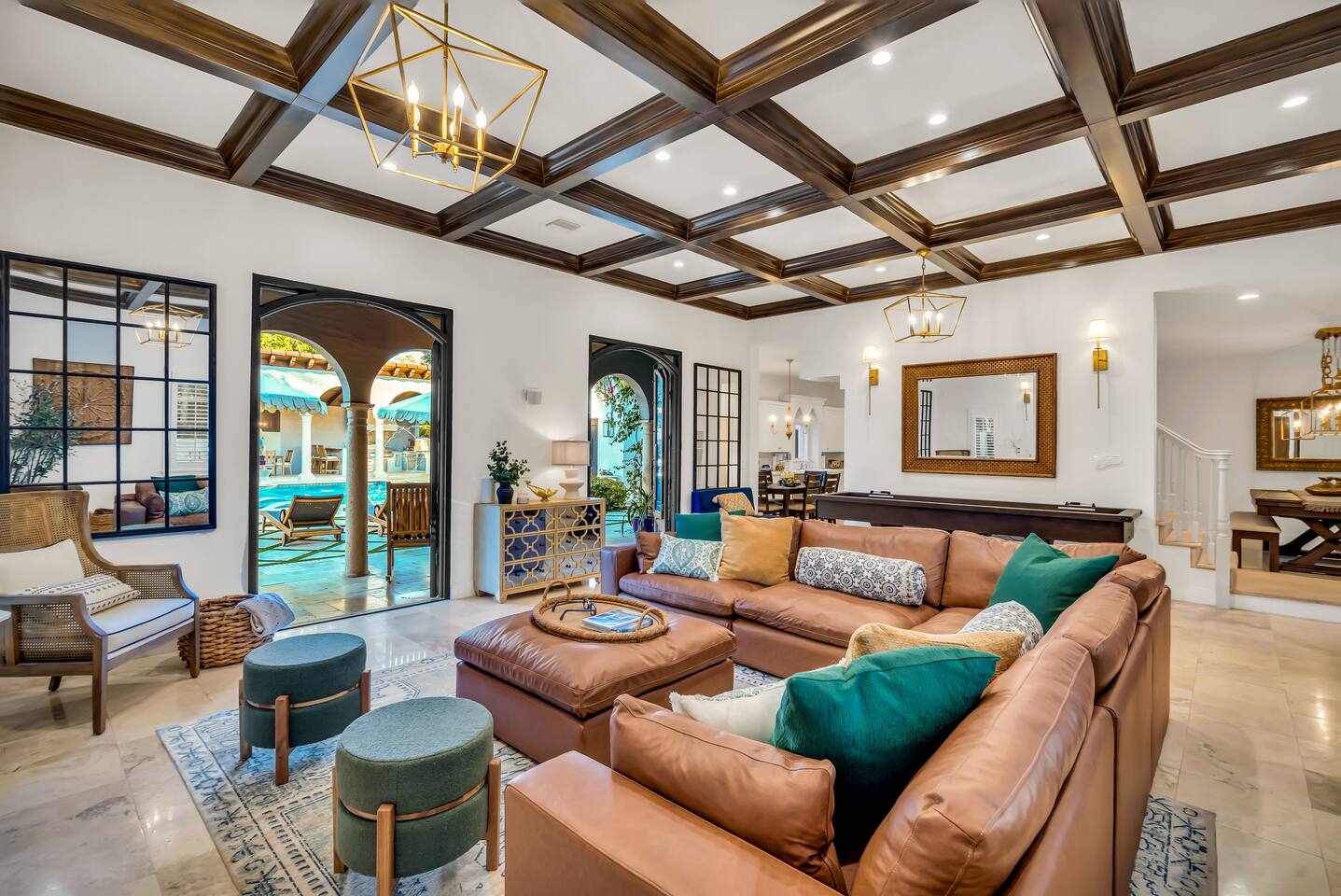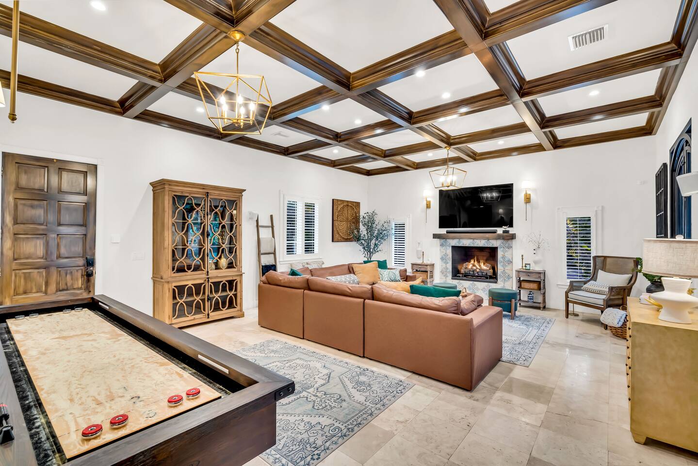 Indulge at this Mediterranean estate, boasting lush botanical gardens and rare tropical fruit trees for your picking pleasure. Enjoy the custom pool, hot tub, sauna, cold plunge and the home gym. The expansive outdoor haven features a fully-equipped kitchen, fireplace, TV, and dining space. Enjoy leisurely games of pool, ping pong & shuffleboard, then retreat to the luxurious indoors with comfortable beds and a massive TV, all within the privacy of a walled-in estate. Your lavish escape awaits.